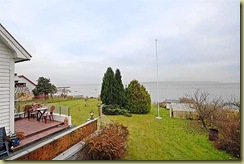 Dette er nederste delen av hagen. Utsikt rett mot Jeløya på Mossesiden. Her krysser Bastøfergen over flere ganger hver time. Flaggstang – er det noe å ha? Ser for meg mye stress med å huske å flagge på alle de rette dagene, noe med klokken åtte og ni, kongefamilien og solnedgang – men kan man redde seg unna med en vimpel, kanskje? Eller kutte den ned i hengekøyeholderhøyde?